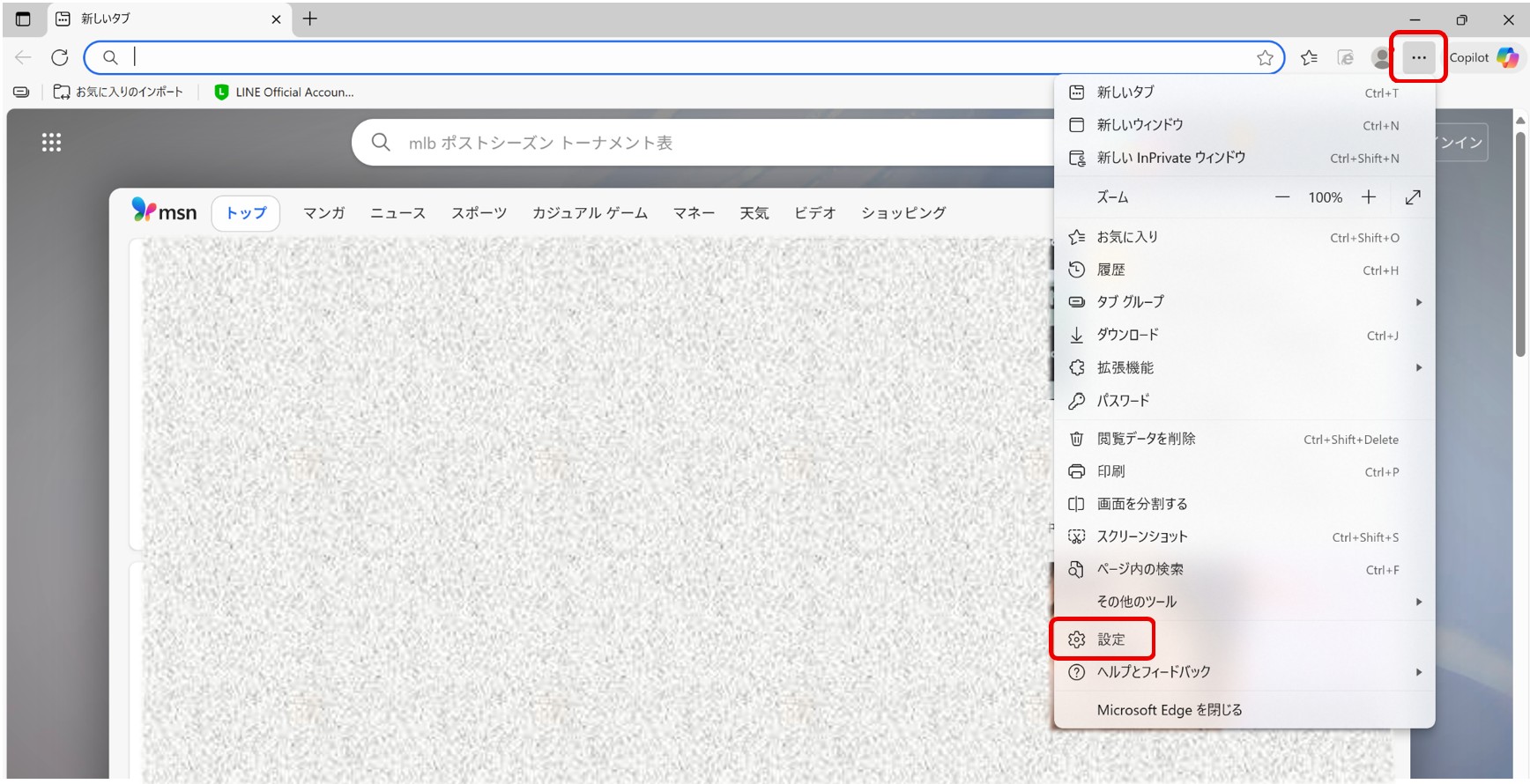 ① 右上の「・・・」をクリックし、「設定」をクリックします。