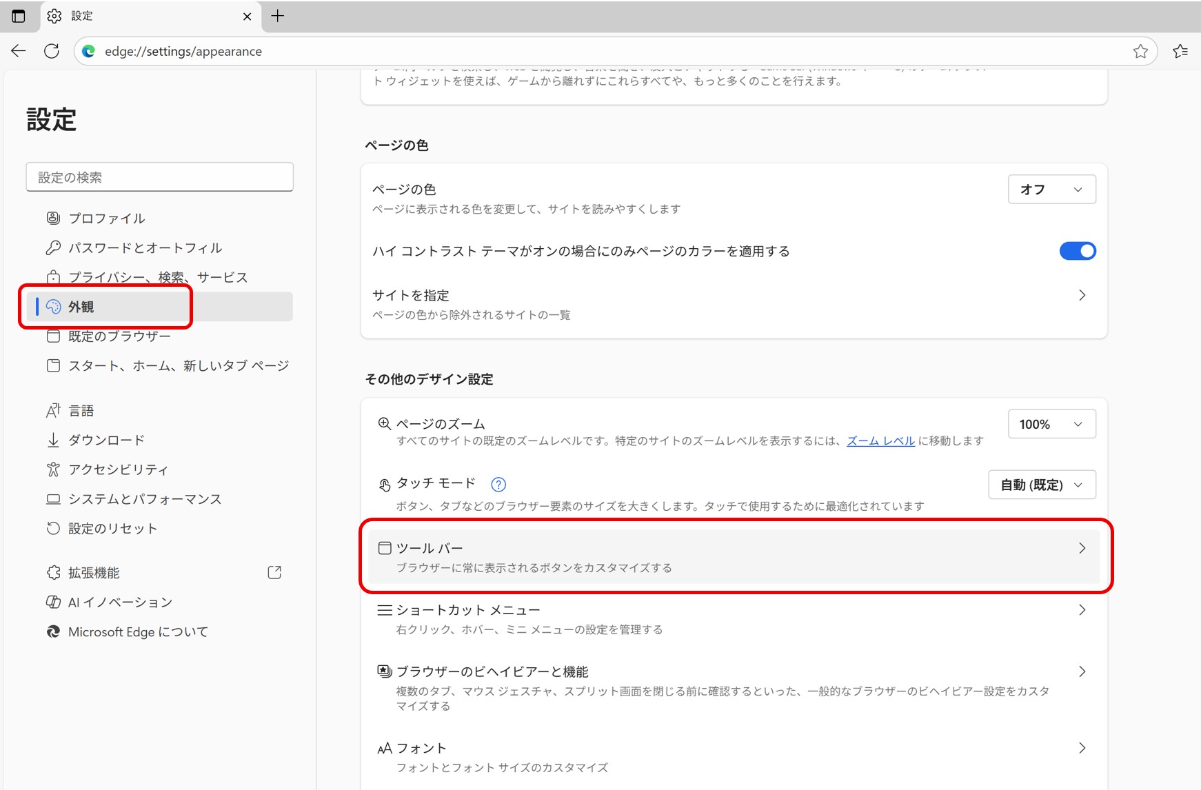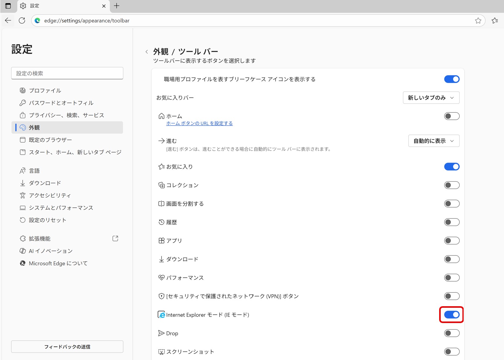 ④ 「外観 / ツールバー」の「Internet Explorerモード(IEモード)」をクリックし有効にする