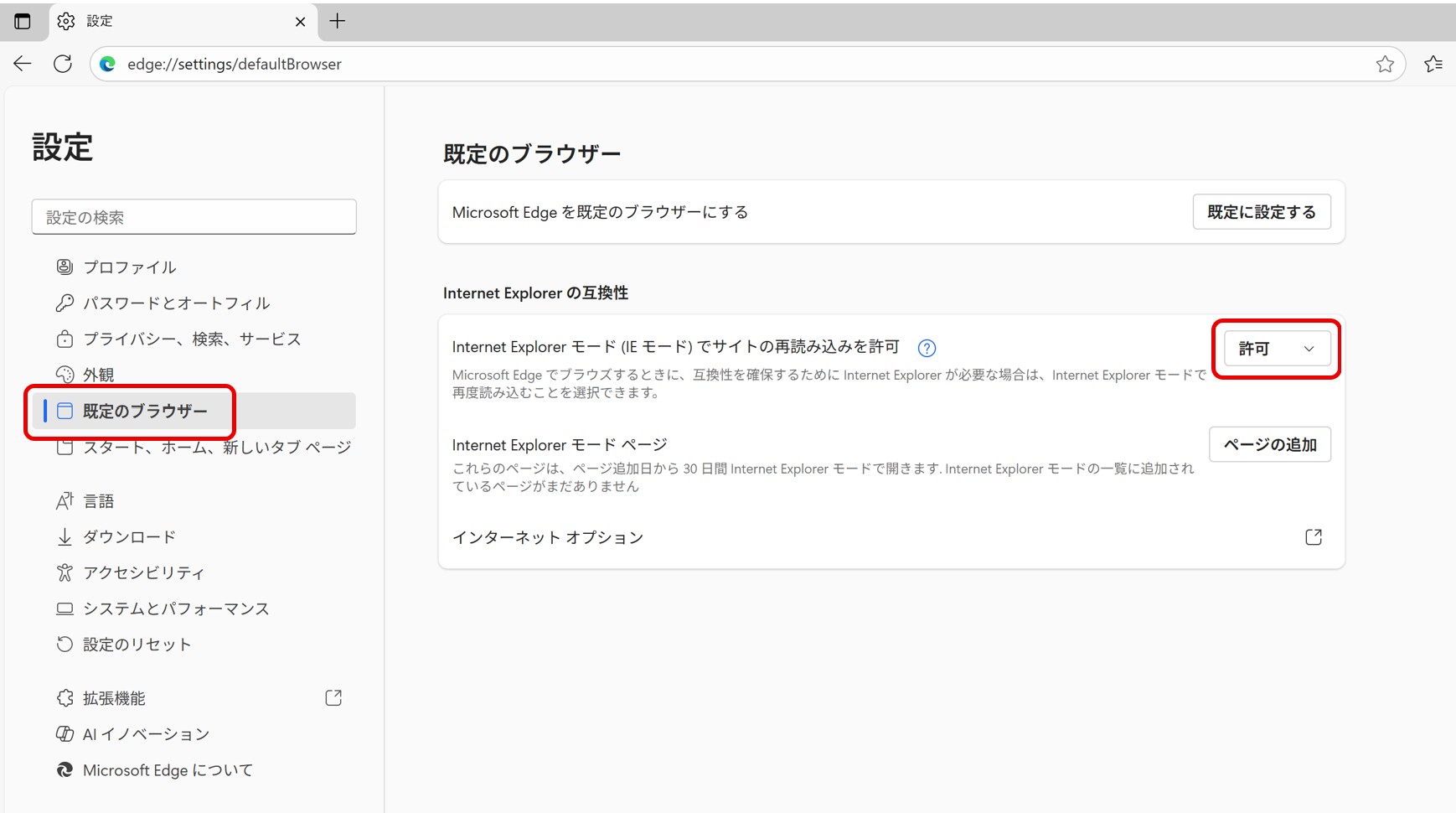 ② 「既定のブラウザー」→「Internet Explorer モード(IEモード)でサイトの再読み込みを許可」を有効にします。